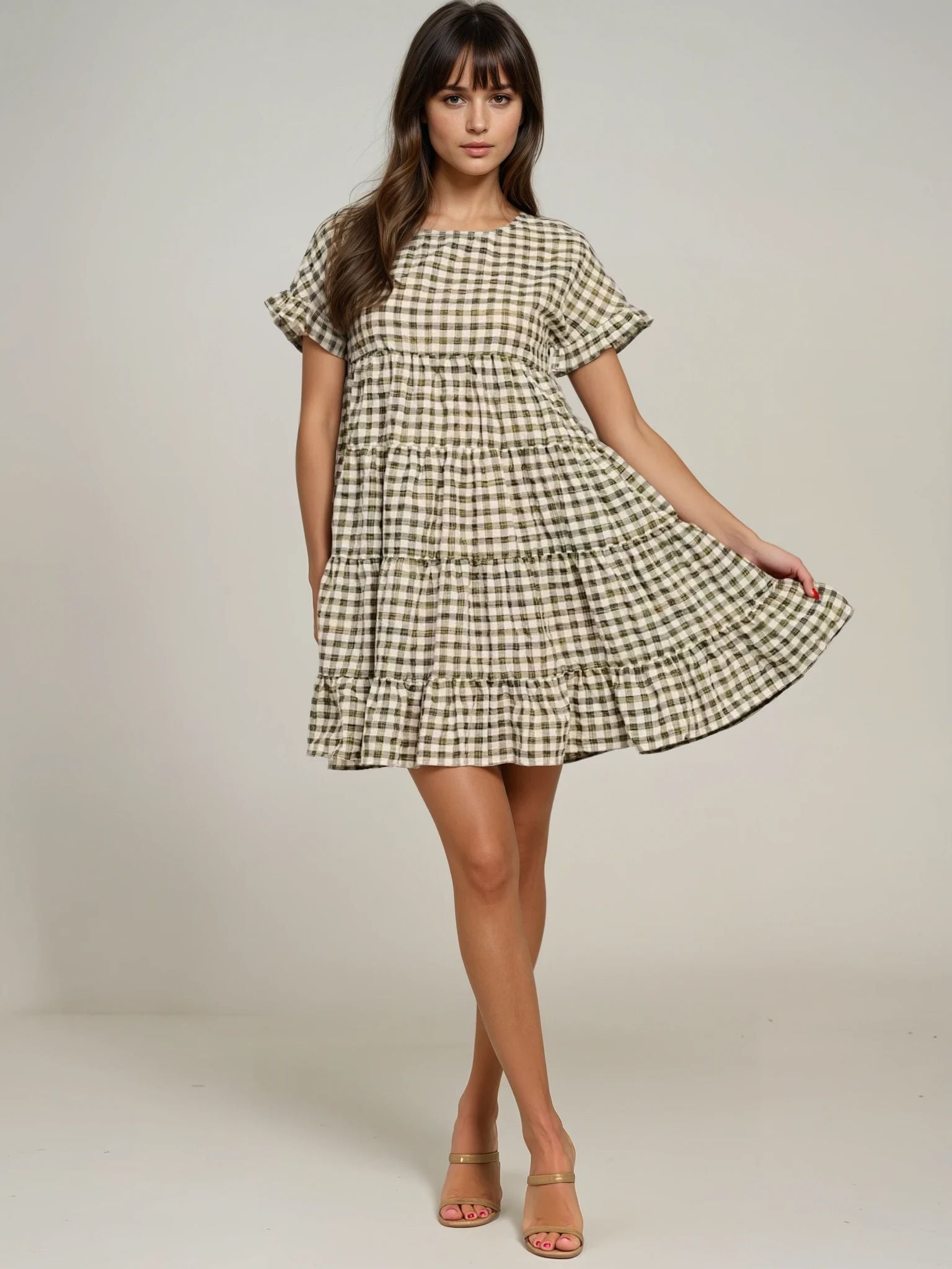Elevate your wardrobe with this sophisticated loose fit plaid mini dress. Featuring short sleeves and a tiered design. it offers a modern silhouette with comfortable movement. The classic plaid pattern adds timeless charm. making it perfect for both casual outings and refined occasions.