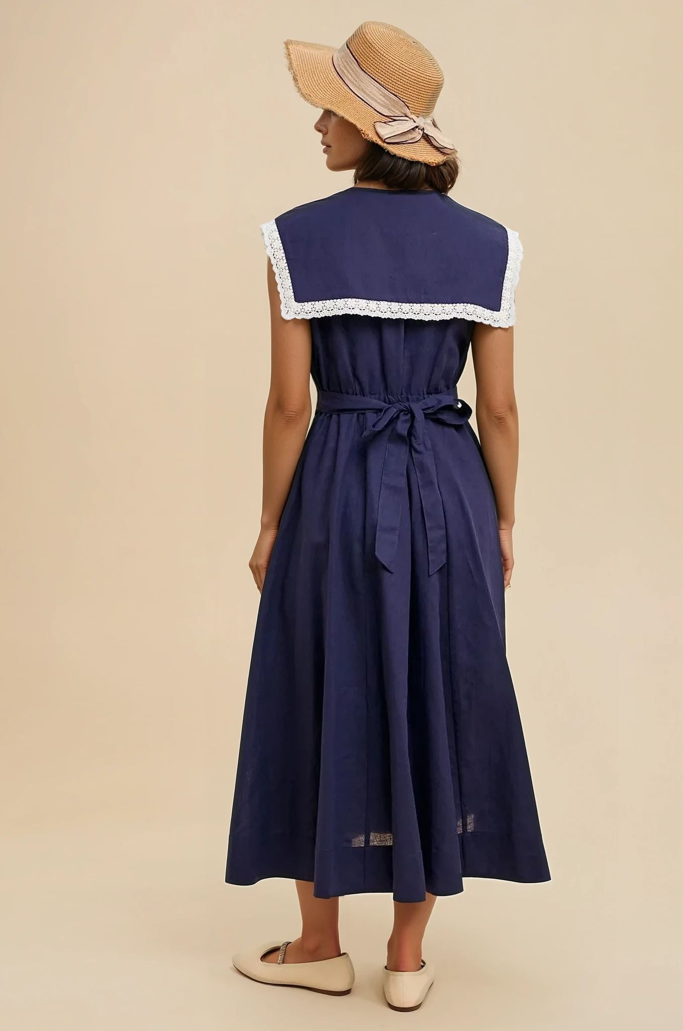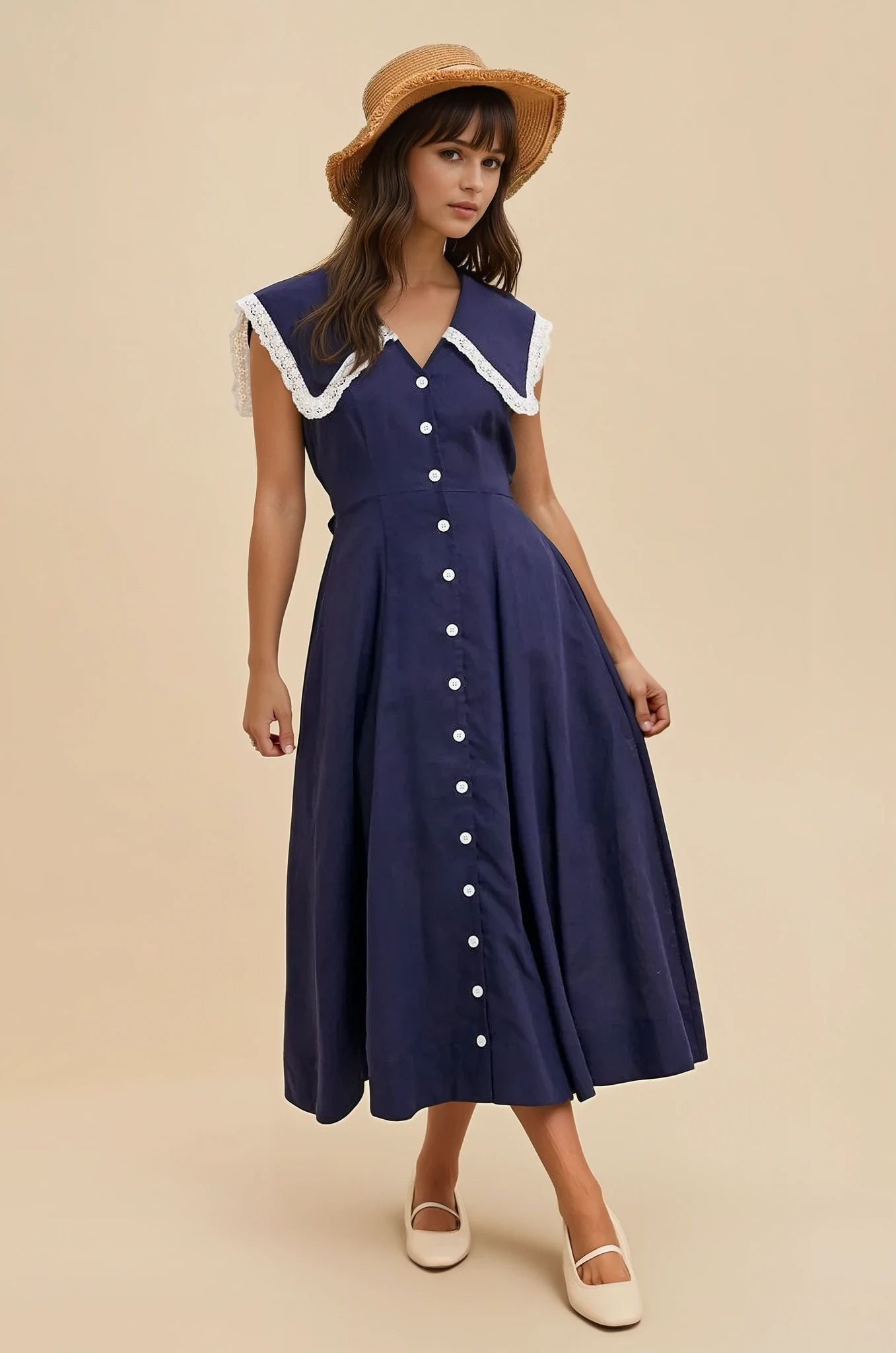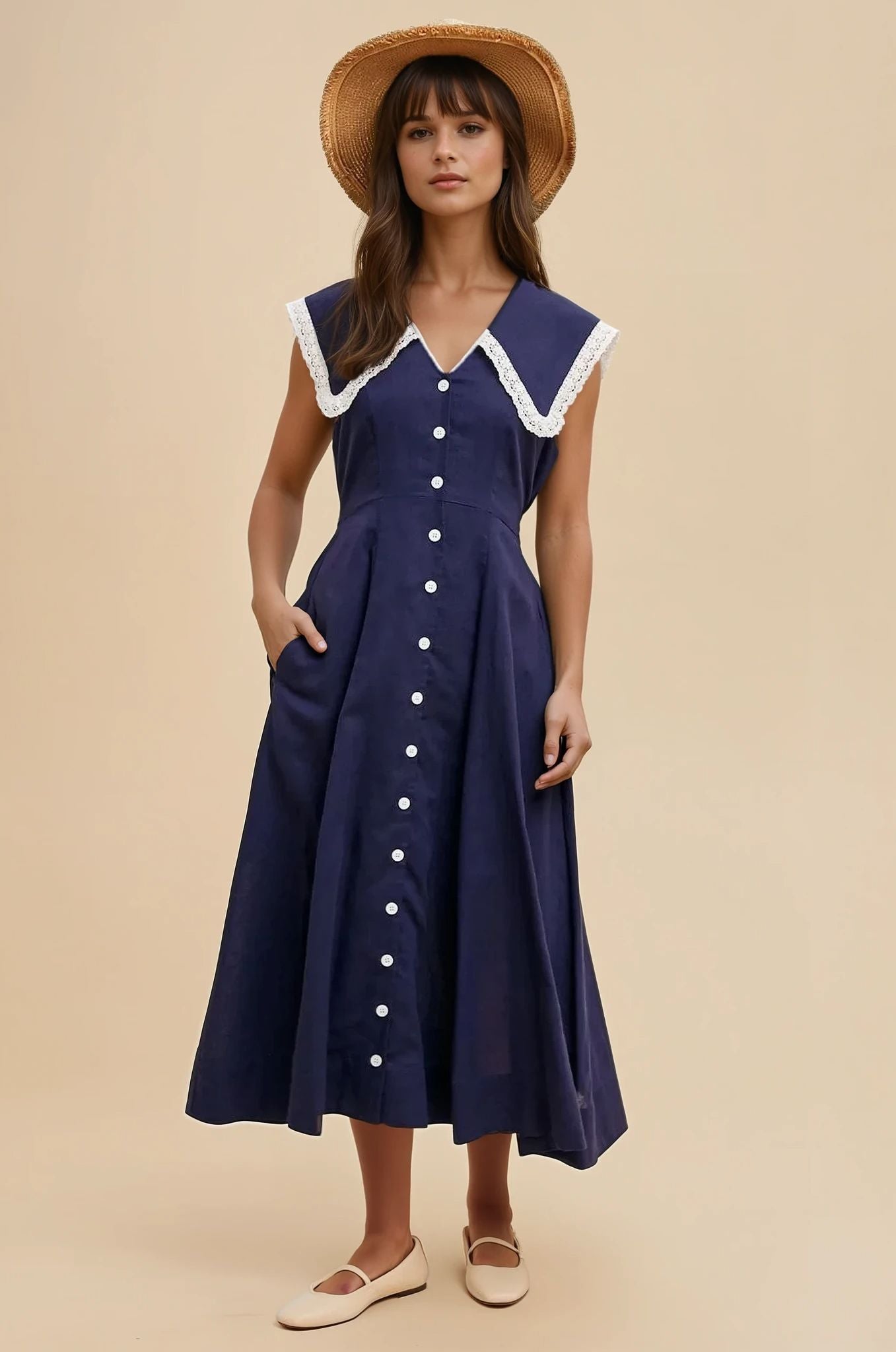 Introducing the Clara Statement Collar Midi Dress. A true gem of sophistication and luxury. this dress boasts a maxi length for a striking silhouette. a statement collar that exudes elegance. and exquisite button detailing for a touch of glamour. Complete with a v neck design for a sensual and refined look. Elevate your wardrobe with this must-have piece.