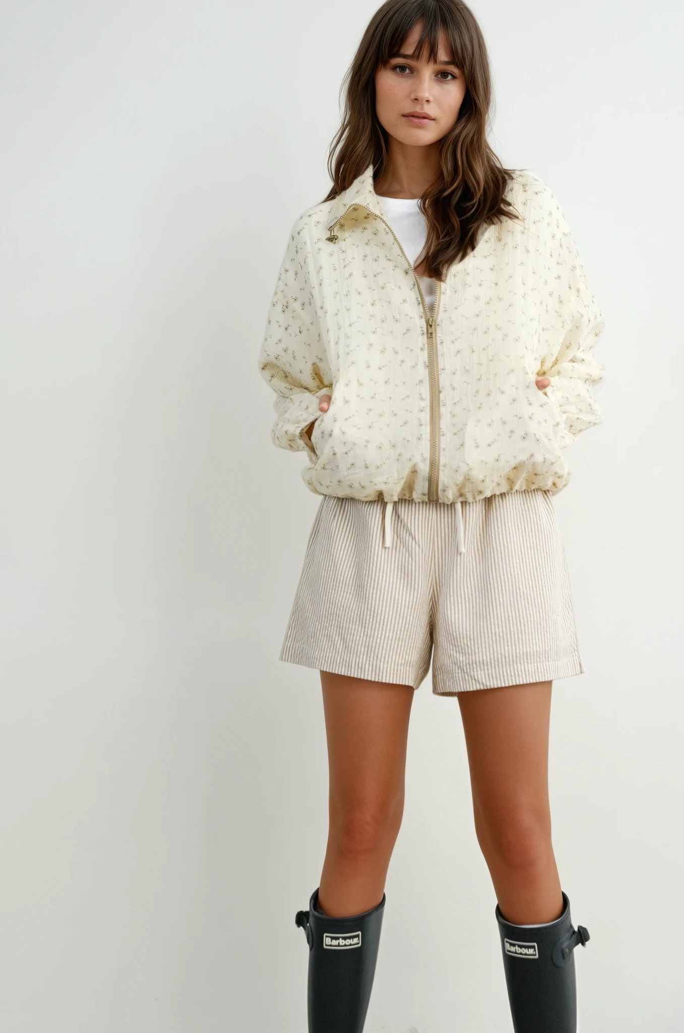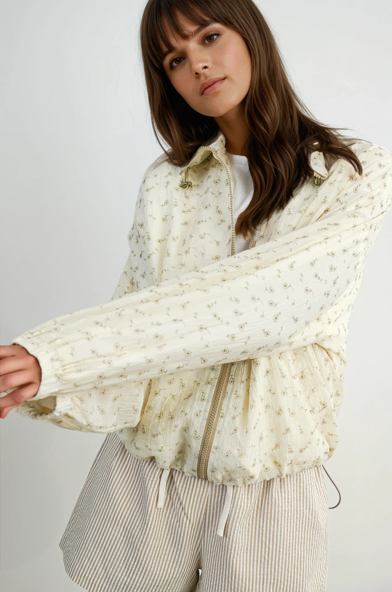 Elevate your autumn wardrobe with the Desi Floral Collared Jacket. Featuring a refined zip-up front and elegant collared detail. this jacket showcases a delicate floral design perfect for the season. Its versatile style makes it an essential fall staple. blending sophistication with everyday comfort.
