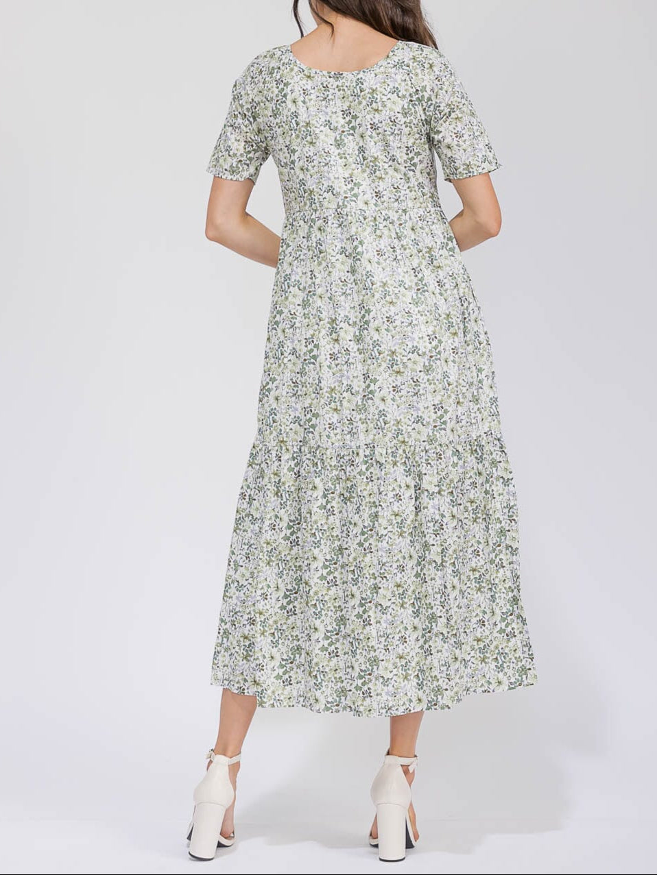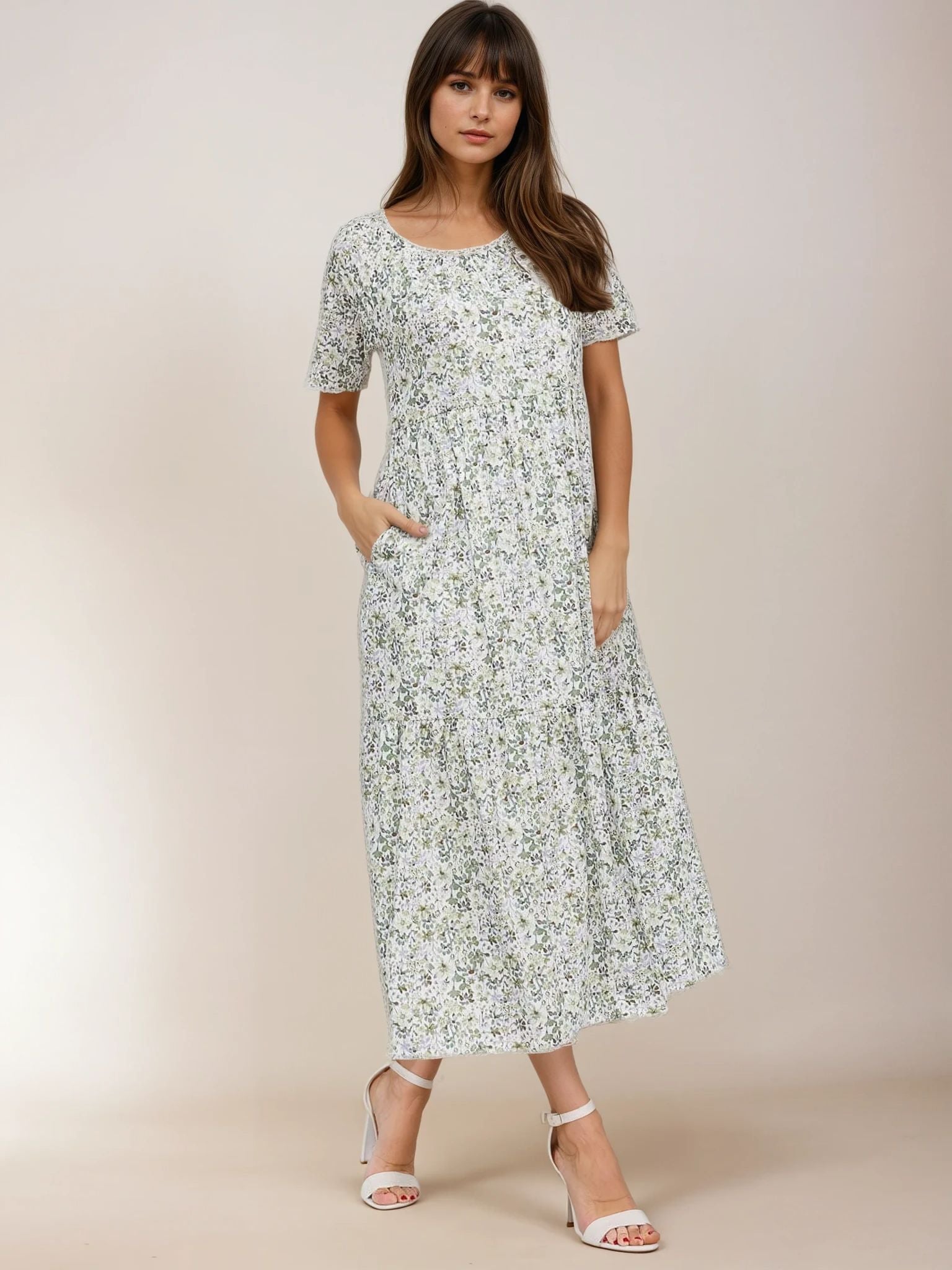 This tiered floral maxi dress combines elegance with practicality. featuring a flattering V-neck and short sleeves for a refined silhouette. Designed with convenient pockets and a flowing tiered skirt. it offers both style and comfort. making it perfect for any sophisticated occasion.