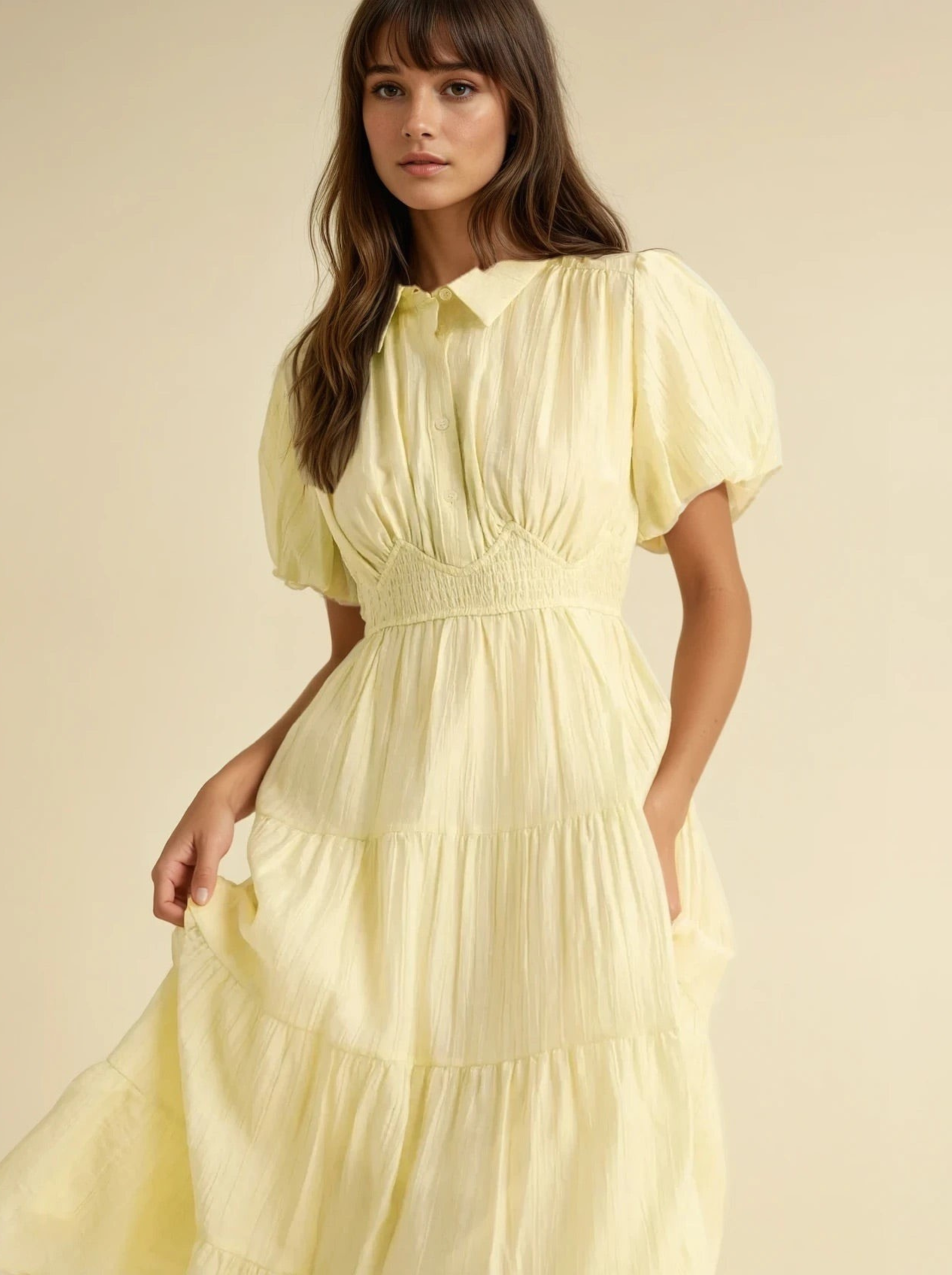 Elevate your wardrobe with our Lillian Smocked Waist Midi Dress. Exquisitely designed with a smocked waist and puff sleeves. this dress exudes sophistication. The collared neck adds a touch of elegance to this modest. midi-length dress. Perfect for any occasion. it’s a must-have for any fashion-forward individual.