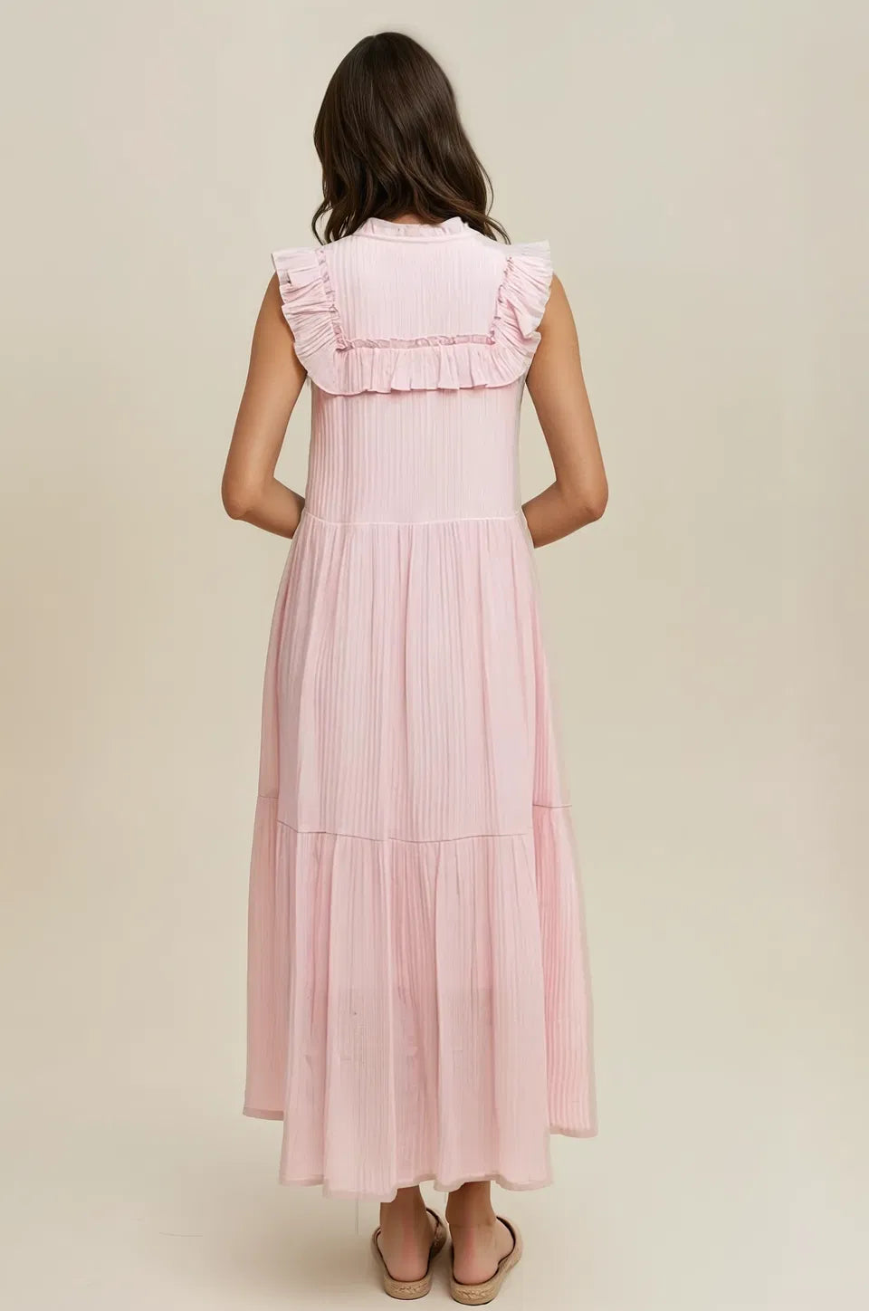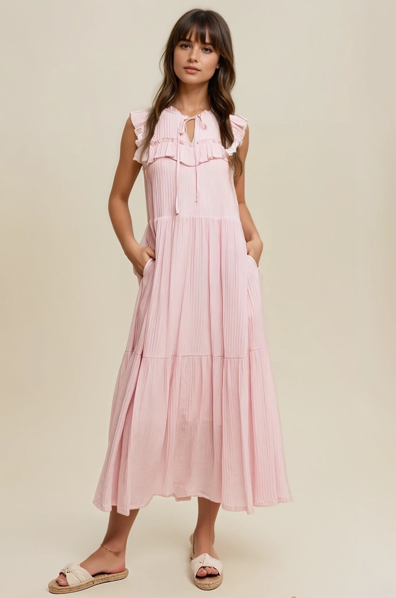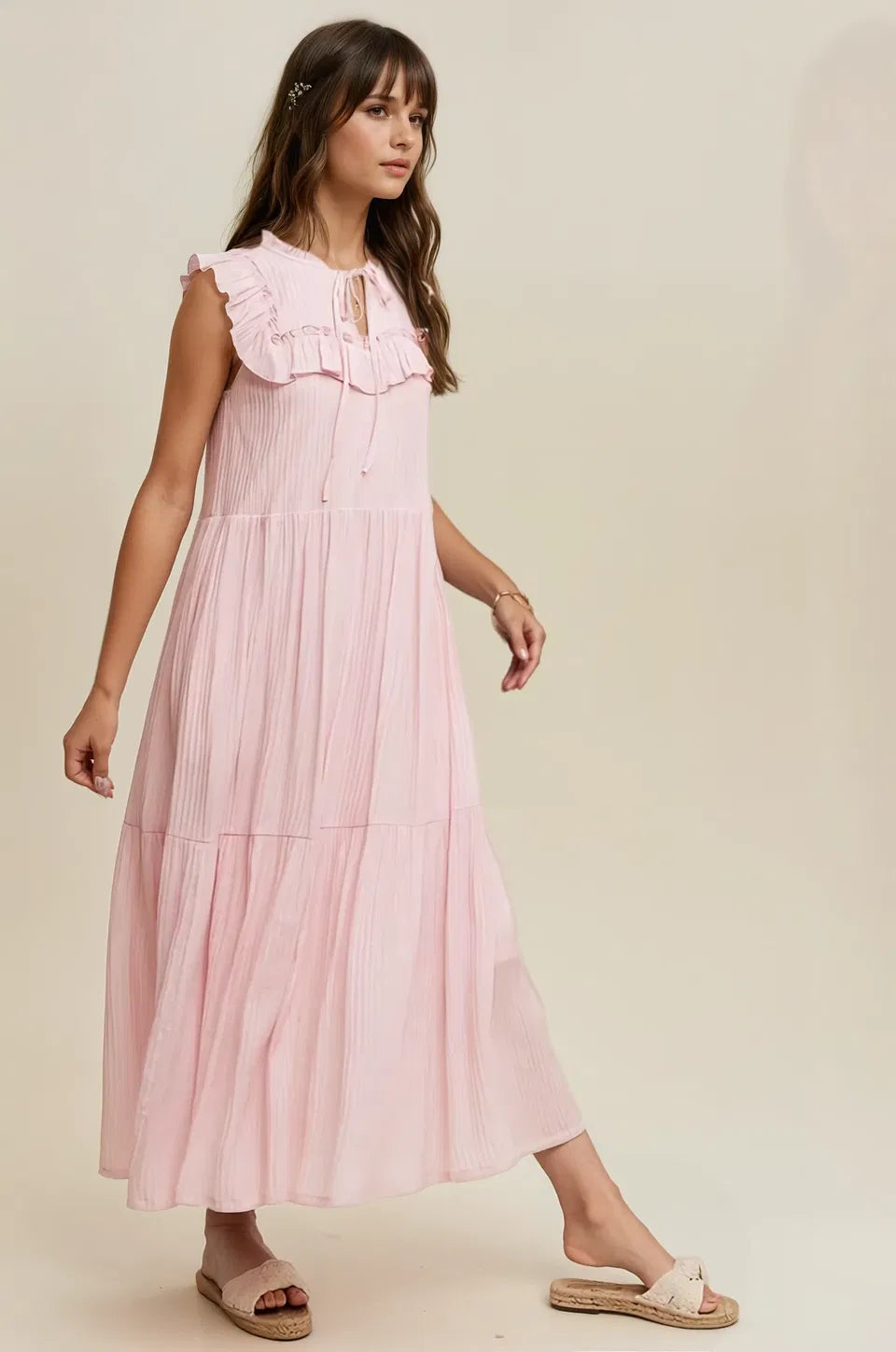 Introducing the Scottie Summer Maxi Dress. a dreamy and luxurious piece perfect for your summer wardrobe. With its elegant ruffle collar. flattering front tie. and flowing design. this maxi dress exudes sophistication and style. Embrace the warm weather in this ultimate summer maxi dress.