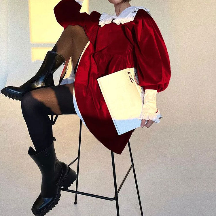 This velvet mini dress has a contrast white collar . a puff sleeves. and contrast trim on the cuffs
